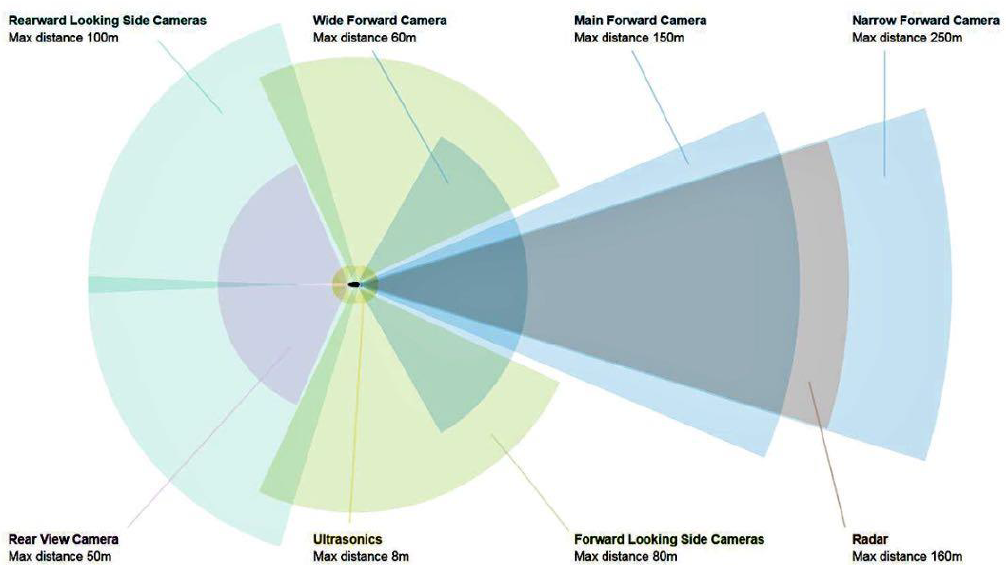 那Tesla目前又是如何实现的?Tesla采用“8+1”仿生视觉配置,装配8颗摄像头,1颗毫米波雷达。环绕车身共配有8个摄像头,其中包含一个三目前置摄像头,组合视野范围达360度,对周围环境的监测距离最远可达250米(一颗前视三目摄像头,包括前视宽视野、主视野、窄视摄像头各一颗安装于挡风玻璃后;两颗侧后视摄像头,装在翼子板上位置靠前;两颗侧前视摄像头,装在B柱,位置在侧后视的安装位置之后1m;一颗后视摄像头,安装于车尾箱牌照框上方)。Tesla所配置的一颗前置毫米波雷达(位于前保险杠靠下方的位置)可视范围达160m(辅助配有5颗车身环绕雷达、12颗超声波雷达)。