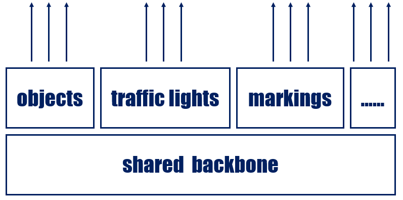 Tesla使用HydraNets架构,进行主干共享,类似于迁移学习,拥有共同模块和为特定的相关任务训练的具体模块,HydraNets的主干用所有的目标来训练,具体内容用于训练具体的任务,有利于提高推理和训练速度。同时叠加多摄的深度估计及鸟瞰图,在立体视觉和传感器融合的基础上,Tesla可摆脱激光雷达。