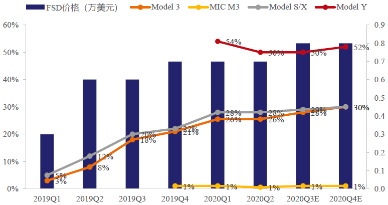 目前Tesla硬件预埋,软件选择性激活,其FSD选装率持续提升,在推动毛利爬升的同时也将为Autopilot注入更多数据。