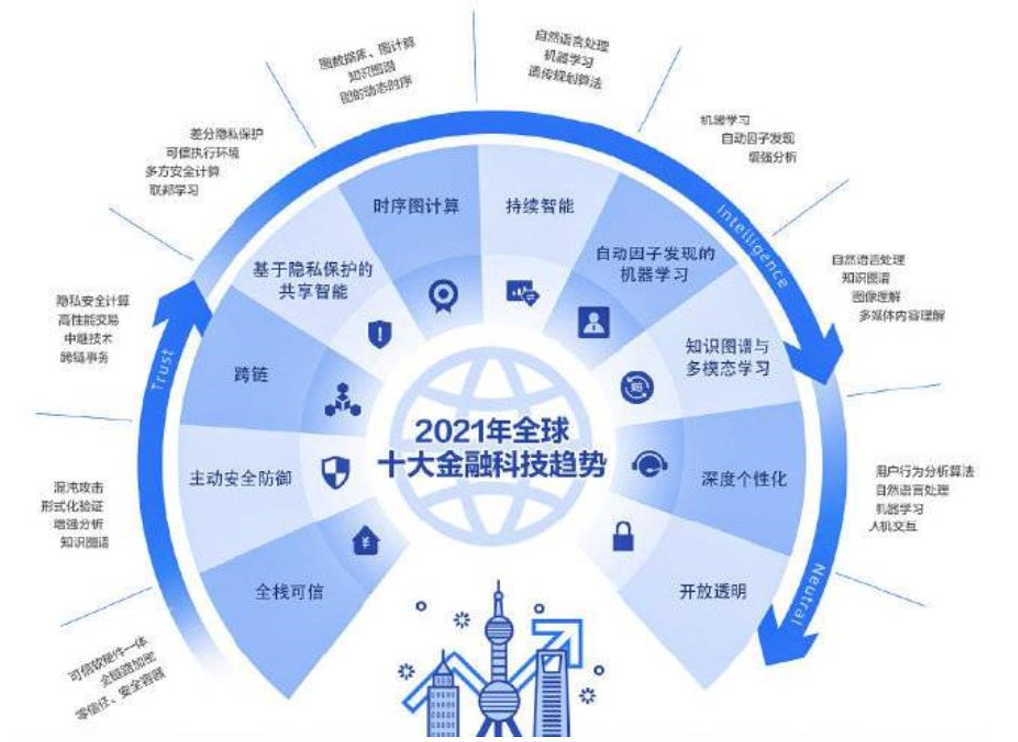 本次“外滩大会”发布了2021年全球十大 Fin-tech趋势,包括全栈可信、主动安全防御、跨链、基于隐私保护的共享智能、时序图计算、持续智能、自动因子发现的机器学习、知识图谱与多模态学习、深度个性化、开放透明,其中六项属于信任构建与隐私保护,深化区块链、人工智能在金融领域的应用。