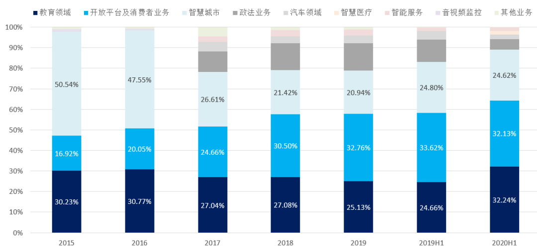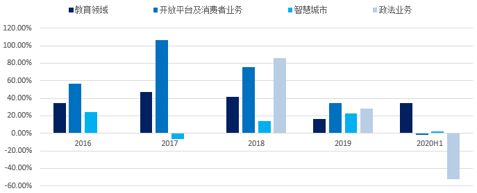 科大讯飞系泛AI企业(语音为本,结合图像、大数据等),目前AI技术的核心应用场景系教育、消费者(主要以智慧硬件为主,涵盖部分软件服务)、智慧城市、政法,且相关板块整体呈上升趋势:消费者领域近几年呈快速上升趋势;2020H1受疫情催动,教育领域实现快速增长。