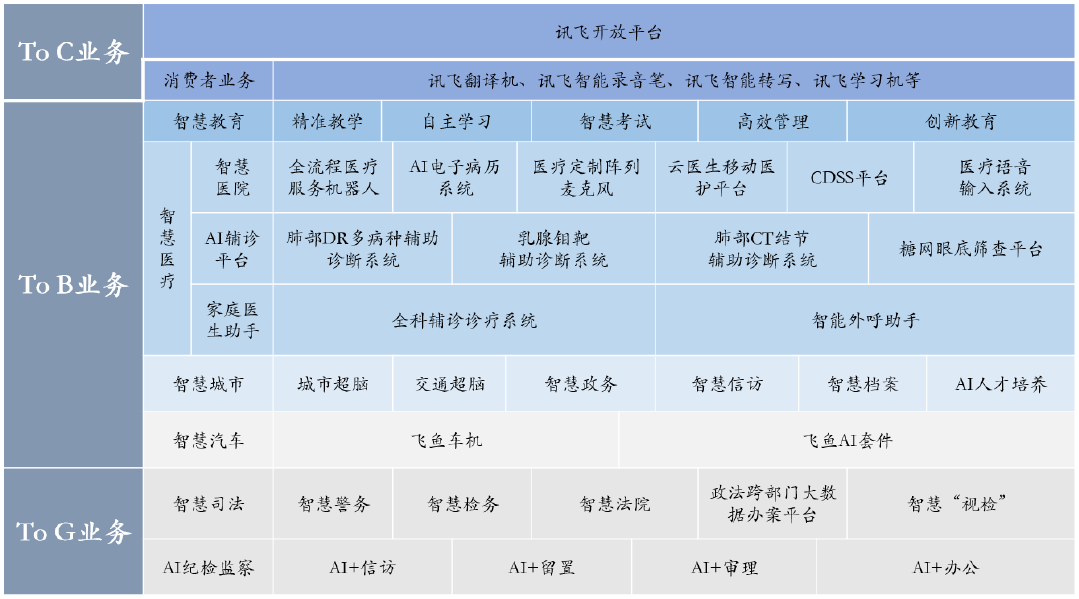 科大讯飞在语音识别、语音合成、语义理解等基础上拓展图像识别、大数据等技术,成为一家泛AI企业,布局场景上包含C端(智能硬件)、B端(教育)、G端(智慧城市、政法),各占约1/3,科大讯飞战略上以C端为未来发展方向,拟实现C端占业务比重80%,但短期内为获得现金流及盈利,B端及G端仍系重要布局方向。