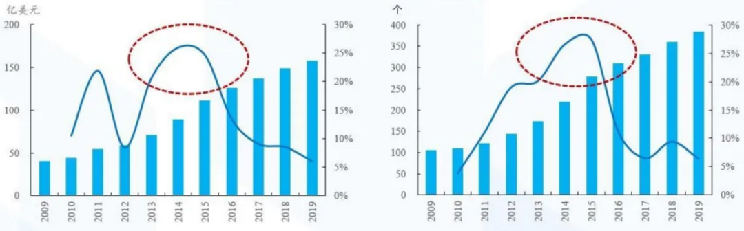 2013-2015年全球智能语音市场规模(左)及企业数量(右):