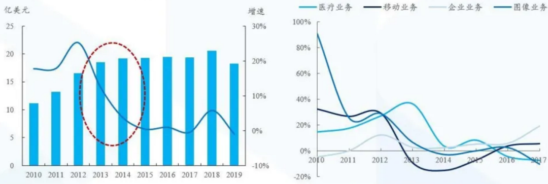 2013-2015年Nuance营收增速(左)及分板块表现(右):