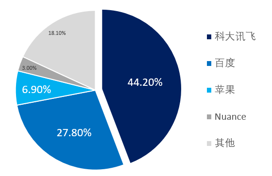 国内AI语音市场主要被科大讯飞、百度、苹果、Nuance等占据。科大讯飞是我国人工智能企业中为数极少掌握核心技术并拥有自主知识产权的企业之一,占据国内44.2%市场份额;百度是全球最大的中文搜索引擎,占据27.8%市场份额;苹果凭借Siri抢占智能语音市场,占据6.9%市场份额;Nuance作为全球市占率最大的智能语音厂商,占据3%市场份额。