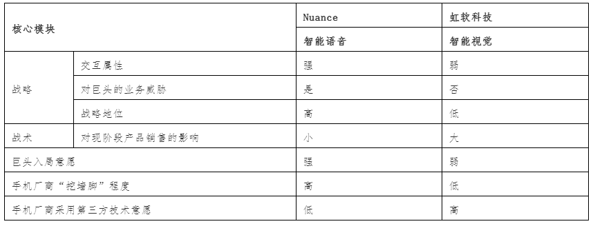 2)对于通用型赛道,战略价值与战术价值的权衡决定着IT巨头的入局意愿。如果对于某一技术模块的定位以及可能对IT巨头造成的潜在风险具有战略价值,则IT巨头入局意愿更强(以虹软与Nuance为例)。