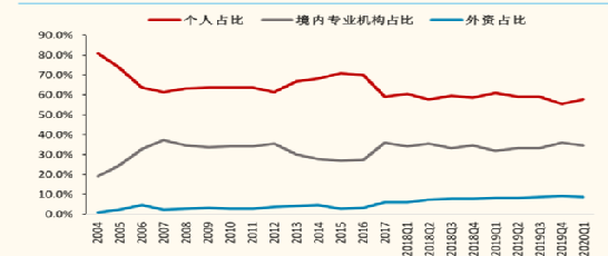 图 2004年至2019年个人持有股票市值占比从80%下降至57%