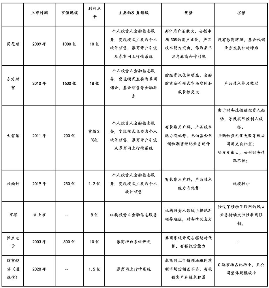 (2)中小投资者客户领域(2C),以炒股软件、炒股网站这类初级金融信息服务为主,其商业模糊主要为以大量免费用户为基础,筛选少量收费用户,或者通过广告获得收入,或者利用大规模客户为基础,发展互联网金融模式,进行理财产品的网络代销,代表企业为同花顺,东方财务和大智慧。
