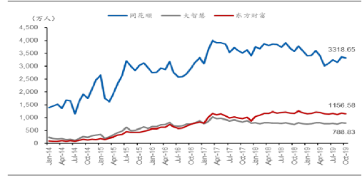 图 同花顺用户月活数远超主要竞争对手(万人/月)