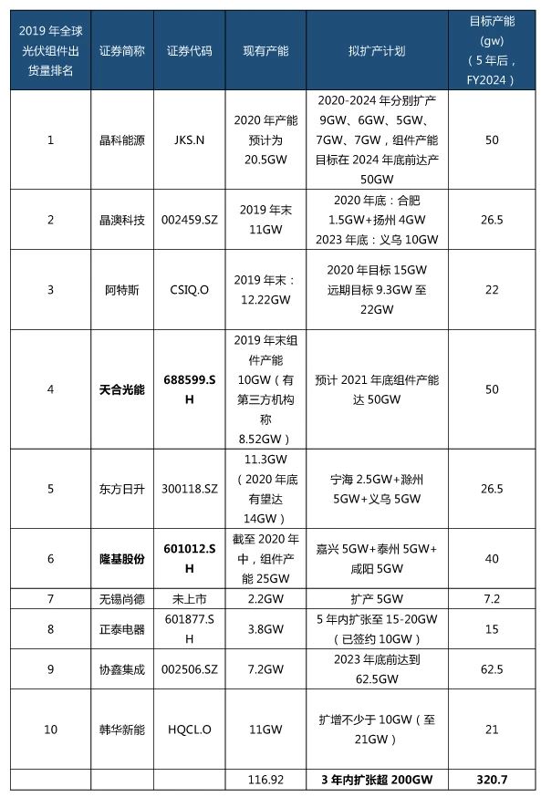 终端组件出货量和产能是光伏产业发展的风向标。目前,中国光伏产业已在全球范围内建立了绝对领导力,中国企业占据了光伏组件全球前十大企业的全部席位。我们整理了行业CR10的产能和扩产情况: