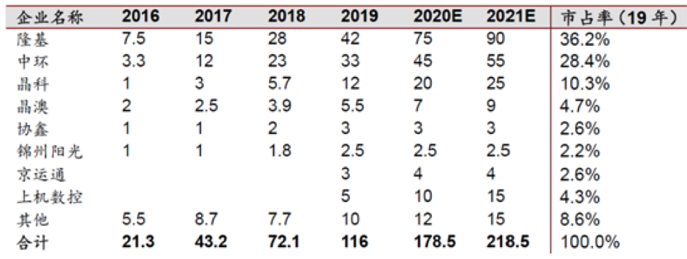 目前硅片环节已形成隆基股份、中环股份双寡头格局,市场格局较为稳定。2019 年,隆基股份、中环股份单晶硅片产能分别达到 45GW、30GW,遥遥领先晶科能源(15GW)、晶澳科技(11.5GW)等第二梯队企业。