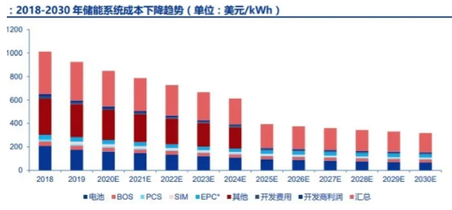 光伏储能系统的成本持续下降,终极平价远景可期。根据 BNEF 数据,2019 年储能系统成本约为 331 美元/kwh,与 2018 年相比下降 9.1%。未来随着储能技术的持续进步,储能系统成本呈现连续下降趋势。根据IHS Markit,预计至 2025 年,储能系统成本有望下降至 203 美元/kwh,与 2019 年相比下降 38.7%;至 2030 年,储能系统成本有望下降至 165 美元/kwh,与 2019 年相比下降 50.25%。
