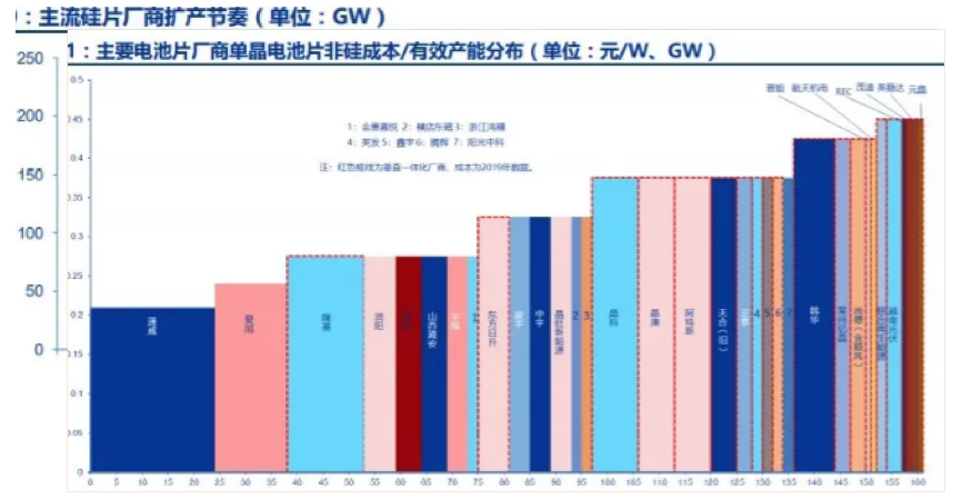垂直一体化厂商中,隆基乐叶、晶科能源、晶澳科技的单晶电池成本、产能处于领先位置,有效产能分别在15GW、11GW、11GW,第一梯队成本与规模优势明显,市场份额有望进一步提升。