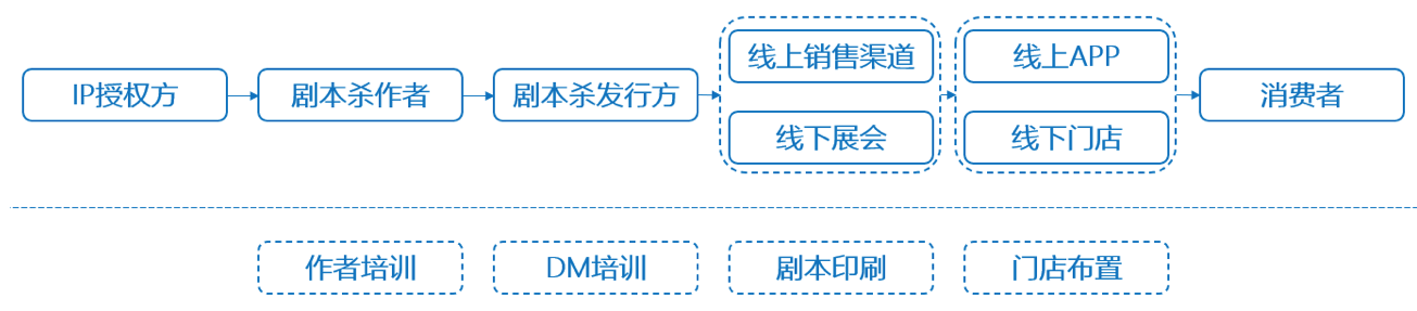 剧本杀已经形成了完整的产业链,包括上游的剧本创作、中游的剧本分发、下游的剧本运营,以及终端玩家。