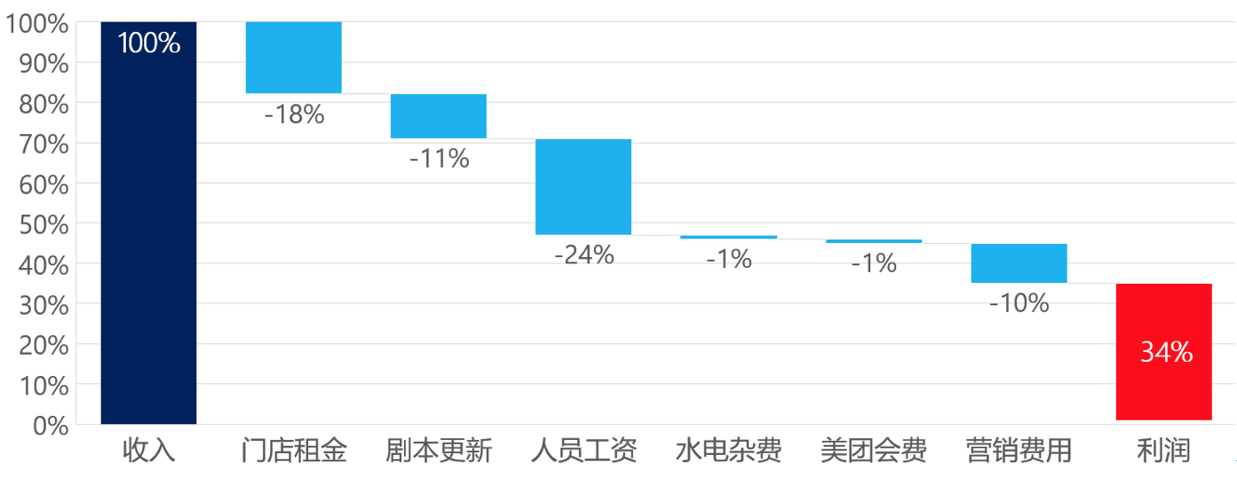 由于剧本有生命周期,总会被玩腻,一个熟悉的剧本吸引力和可玩性会大大下降,经典的剧本复玩也会逐渐失去新意,而终端的核心客群又是发烧友,因此剧本类似耗材,定期需要更新。虽然单个剧本的售价及销量有限,但随着行业规模的扩大,分发的规模会更上一个台阶,但这也对上游的创作提出更高的要求。下游是商家购买剧本并提供场地、服装的环节。目前包括线上APP及线下门店,但对于重体验、社交的游戏,如果没法面对面交流、形成良好的交互,游戏体验将大大降低,尤其是剧本杀作为一种群体社交的游戏。因此头部APP也因为玩家找不着感觉、留存率低等原因,而逐步转战线下。目前剧本杀店的一次性投资在20万元,按照70元/人/次,日均4-5场,场均6-7人计算,月营收在6-8万元,盈利在2-3万元,也算小而美的生意。