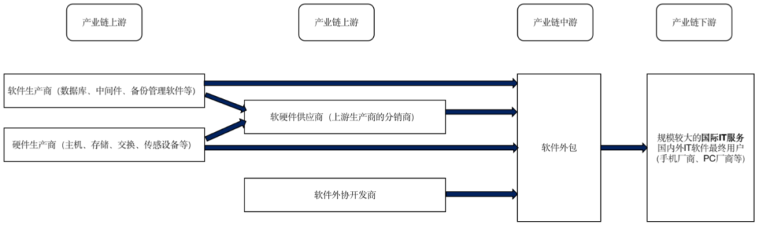 行业上游包括软硬件生产商及供应商,为软硬件外包行业提供基础性的软硬件产品,主要包括:操作系统、常用应用软件、数据库、中间件、备份管理软件等。这些产品主要由IBM、Microsoft、Oracle等公司提供;硬件包括小型机、微型机、存储设备、交换机、路由器和物联网感知设备等,在高端市场上仍被IBM、EMC和Cisco所统治,国内华为、联想等企业属于低端硬件供应商。虽然短时间内这些基础软件生产商的地位难以撼动,但也正是得益于此,使得软件外包上游行业成熟度较高,在市场上应用范围广,可供选择的渠道多样化程度高,同时软件外协开发商由于数量众多且议价能力不足,价格也较为稳定,故产业链上游行业对软件外包的成本影响较小。