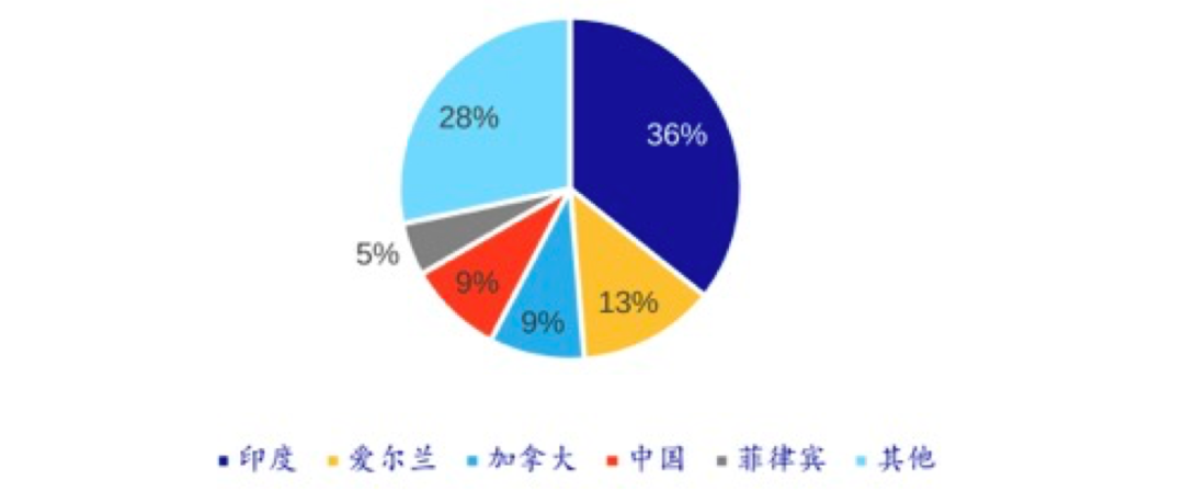 全球软件外包业务的发包市场由美国、欧洲和日本等发达国家和地区主导,市场格局较为稳定。对于接包国家而言,竞争格局较为激烈。其中,印度、爱尔兰、加拿大、中国和菲律宾组成了软件接包国家的第一梯队,合计市场占有率约为95%。中国软件外包接包率达9%,与加拿大接包率等同,全球排名第四。而印度地区以其成本优势赢得客户,占据全球接包市场第一位次,为全球客户解决关键性问题。