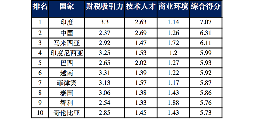 2017年各国外包类服务行业营商环境得分表