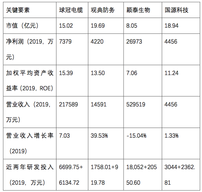 从净利润来看,这四家企业的净利润均满足要求,但是若要符合第一个指标,还要满足ROE大于8%。而市值上,四家企业也都均在8亿元以上。在营业收入的增长率上,满足的条件的则为1家。而从研发投入来看,最多的为颖泰生物的3.8亿元,4家中有3家均满足5000万元以上的研发投入。