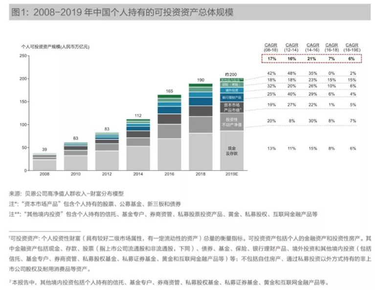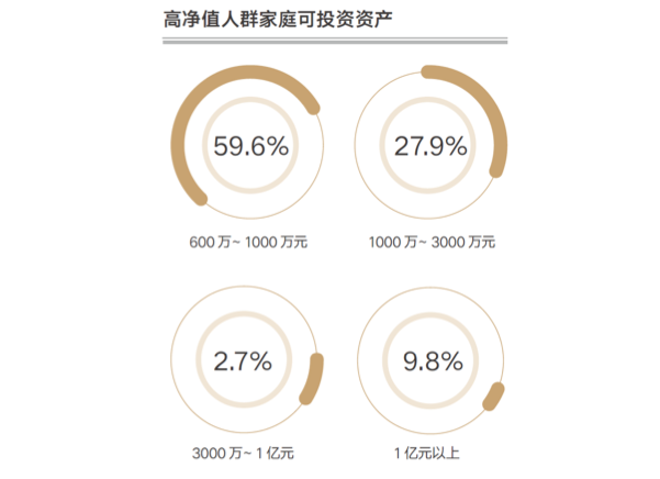 2019年底,中国个人持有的可投资资产总体规模将首次突破200万亿大关。2016-2019年年均复合增长率为6-7%。受实体经济增速放缓及市场波动的双重影响,中国高净值人群的规模及其持有的可投资资产增速也正在放缓。从家庭来看,600万-1000万元是达标的门槛,约六成高净值家庭的可投资资产位于这一区间。1000万元以上,则呈现财富量级和人群数量的指数级分布,1000万-3000万元、3000万-1亿元、1亿元以上的比例,分别为27.9%、9.8%和2.7%。