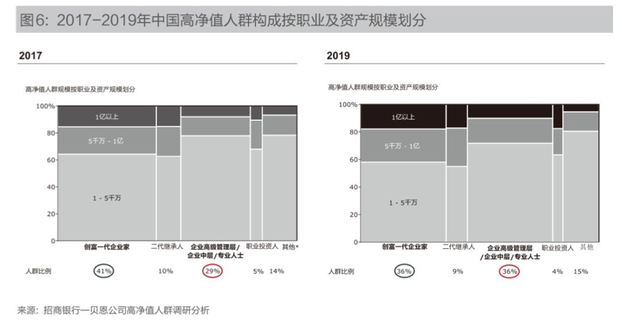 可以推测,新经济、新动能崛起下的股权增值效应,已经在推动企业中、高级管理层与专业人士新富人群涌现。数据显示,2019年企业高级管理层、企业中层及专业人士占全部高净值人群的比例由2017年的29%上升为36%,首次与创富一代企业家群体看齐。二代继承人、职业投资人占全部高净值人群的比例均较2017年有所下降,分别为9%和4%。