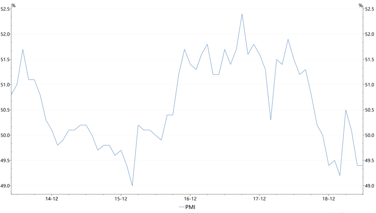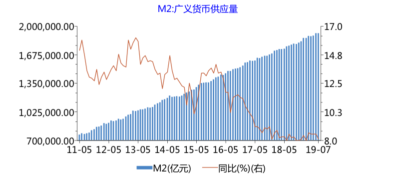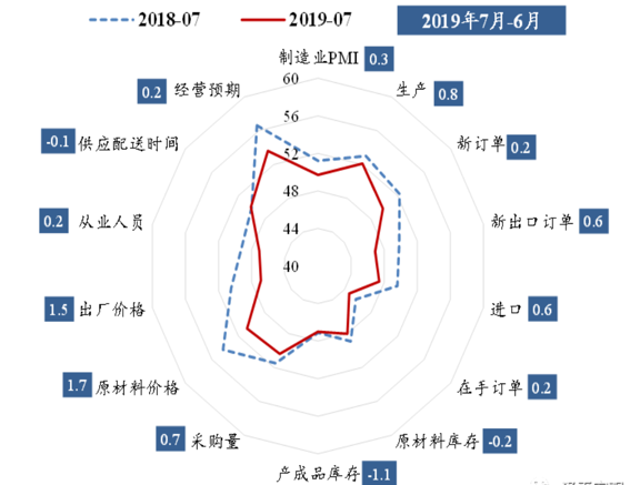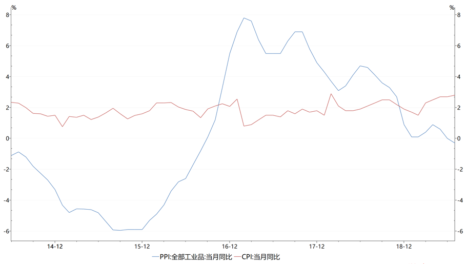 2019年7月PPI同比增长-0.30%,前值0.0%。CPI同比增长2.8%,前值为2.7%。工业品步入通缩,PPI三年来首转负,上游企业利润率持续下降,除食品外大宗商品纷纷下跌,7月特别受国际油价下跌的影响,开采和石油加工业显著回落。