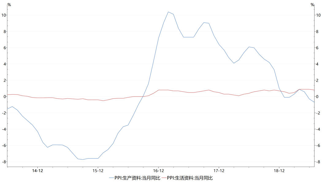 2019年7月生产资料价格继续大幅恶化,生活资料PPI同比回落0.1%。2012-2015年产能过剩,需求较弱的局面再次出现。