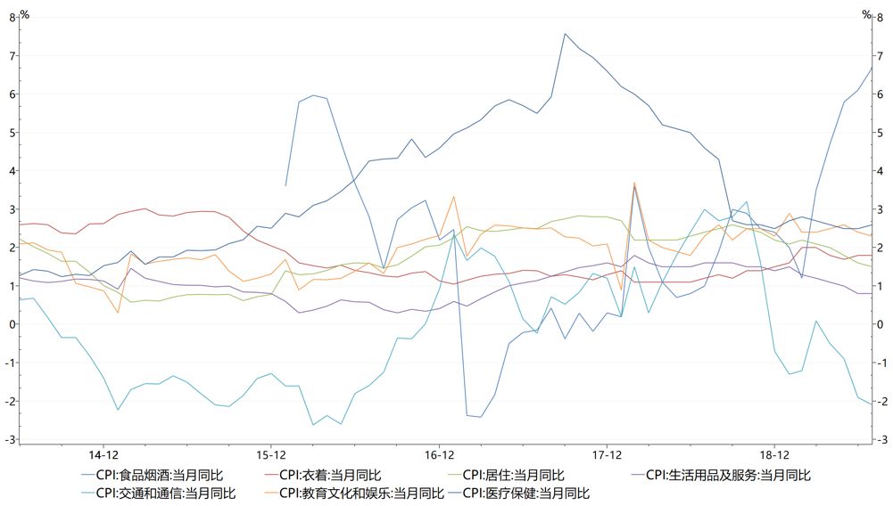 食品价格上涨对冲交通和通信行业价格下降,其他CPI权重较去年同期均有不同程度的下滑,CPI能维持目前水平的唯一推动因素为食品价格。