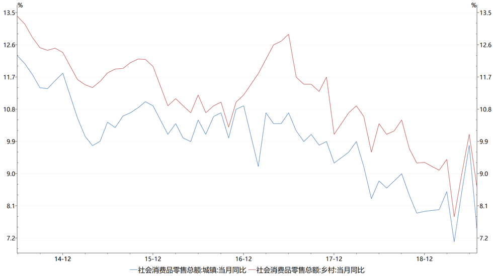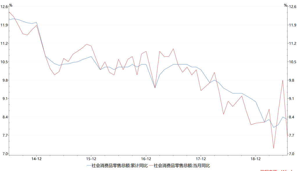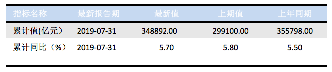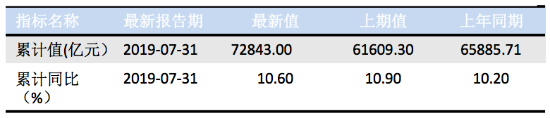2019年7月社会消费品零售总额同比增长7.6%,前值9.8%。社零增速在上月昙花一现后,快速回落,6月国五切换国六,相当程度透支了汽车消费需求。近10年汽车保有量不断上升,新增乏力,去年10月新增市场出现断崖式下跌,汽车销售陷入困境。