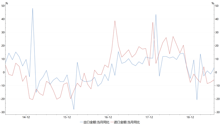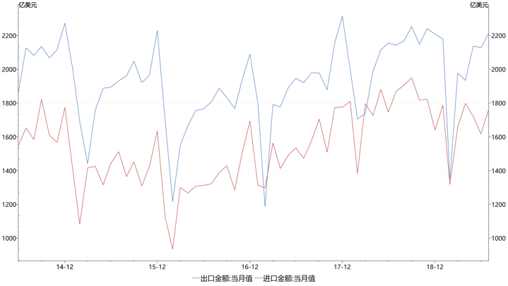 2019年7月中国出口金额2215.30亿美元,同比增长3.30%,前值-1.30%,进口金额1764.80亿美元,同比增长-5.60%,前值-7.40%,贸易顺差450.5亿美元,贸易顺差同比上升63.88%。出口整体低迷,7月出口增速上升,主要是对欧盟和東盟出口增速上升、对美出口小幅上升,源于出口企业转贸市場以及中美落实G20大阪峰会成果。分产品看,农产品和大宗商品进口增速较上月上升,而机电产品和高新技术产品進口同比负增长且较上月下滑。