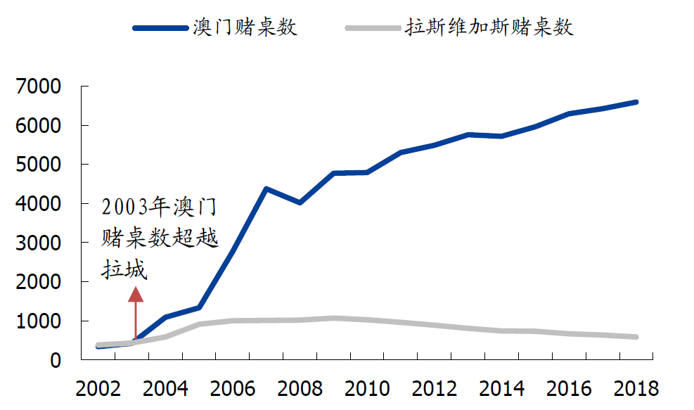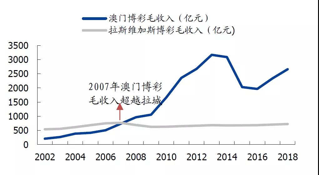 2018年,澳门博彩收入已经高达3029亿澳元(折合约2659亿元人民币),拉斯维加斯为103亿美元(折合约722亿元)。澳门已为拉斯维加斯近4倍。澳门赌桌数为6588张,为拉斯维加斯的11倍。2018年,赴澳门旅客人数为3580万人次,人均博彩支出为7426元,赴拉斯维加斯人数为4212万人次,人均博彩支出为1714元。赴澳游客人均博彩支出是拉斯维加斯的4.33倍。