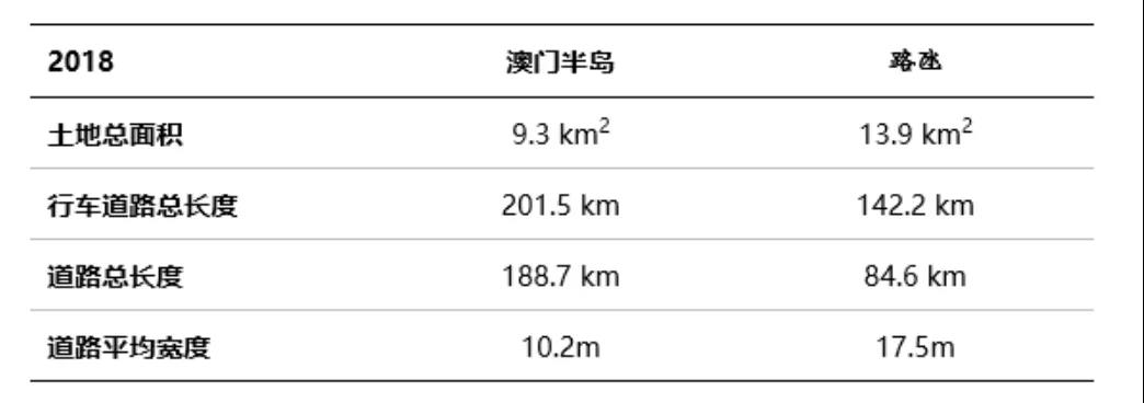 政府的导向和投资使得路氹城填海面积迅速扩大,基建项目迅速增加,1999年至2018年基建指标中,氹仔道路的年复合增长率为2.2%,而澳门半岛的道路长度年复合增长率仅为0.6%。