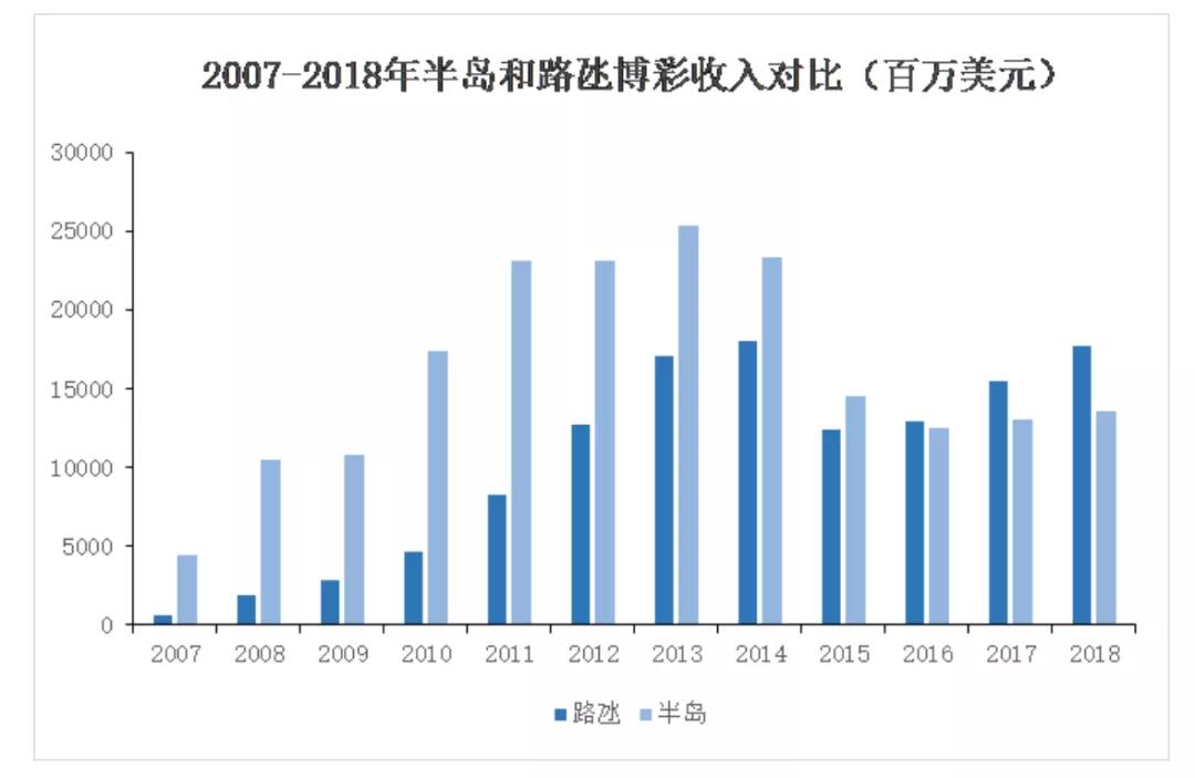 从2014年开始,博彩业的贵宾业务受到严重打击,贵宾业务较多的半岛收入缩水5成,而路氹城中场(散客)业务强劲带动,在打击之后迅速反弹回归正轨,收入反超半岛。